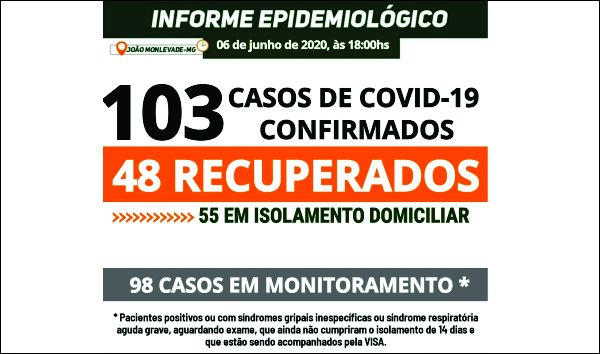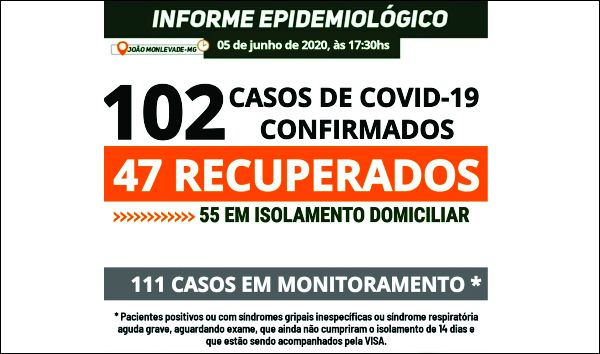 MONLEVADE TEM 102 CASOS DE COVID-19. NÃO HÁ PACIENTES INTERNADOS COM A DOENÇA E, AGORA, 47 ESTÃO RECUPERADOS Os casos confirmados hoje, em isolamento domiciliar, são: - duas mulheres, de 30 e 33 anos, testadas pela rede pública - duas ...