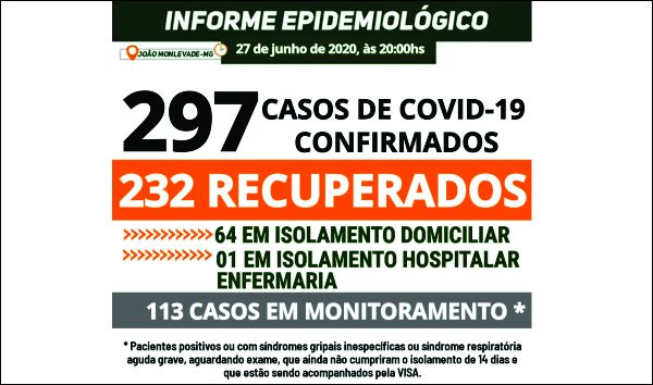 MONLEVADE TEM 297 CASOS DE COVID-19. AGORA, 232 PACIENTES ESTÃO RECUPERADOS DA DOENÇA Os casos confirmados hoje são: - três mulheres, de 42 e 45 anos (dois casos), em isolamento domiciliar - dois homens, ambos de 50 anos, sendo que um deles ...