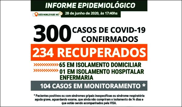 MONLEVADE TEM 300 CASOS DE COVID-19. DESSES PACIENTES, 234 JÁ ESTÃO RECUPERADOS DA DOENÇA Os casos confirmados hoje são: - três mulheres, de 25, 33 e 52 anos, sendo que uma delas está recuperada e as demais em isolamento domiciliar *São...