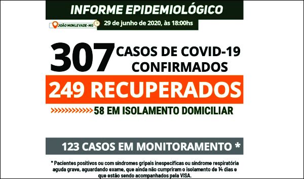 MONLEVADE TEM 307 CASOS DE COVID-19. AGORA, 249 PACIENTES ESTÃO RECUPERADOS DA DOENÇA Nesta segunda-feira, paciente que estava em isolamento na enfermaria recebeu alta hospitalar Os casos confirmados hoje são: - cinco mulheres, de 22, 35, 40,...