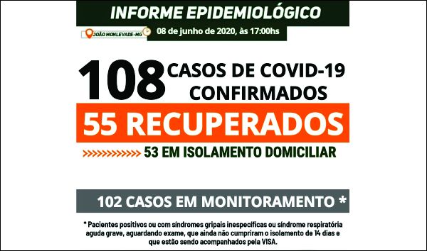 MONLEVADE TEM 108 CASOS DE COVID-19. AGORA, 55 PACIENTES ESTÃO RECUPERADOS DA DOENÇA Os casos confirmados hoje, em isolamento domiciliar, são: - um homem, de 34 anos, testado na rede pública - um homem, de 49 anos...